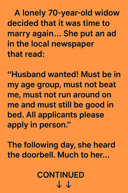A lonely 70-year-old widow decided it was finally time to marry again. After years of quiet evenings and empty mornings, she wanted companionship, but with clear boundaries. So she placed an ad in the local newspaper that read:
