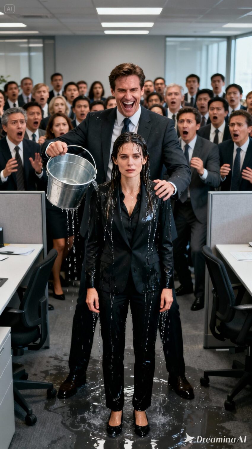 The icy water drenched her completely. Her blazer clung to her body, her hair dripped, her shoes squelched, and cold droplets mingled with tears of humiliation. Forty employees watched in stunned silence as Isabel stood there, soaked and shivering, yet unbroken—a dignity no amount of water could wash away.