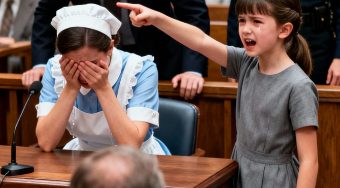The girl, dressed in red, stood trembling, tears streaking her face as she pointed toward the front of the courtroom. The nanny, hands bound in cuffs, lowered her gaze. The billionaire seated nearby avoided looking at either of them, his expression hollow, as if the ground beneath him might collapse.