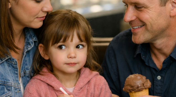 A few weeks after the adoption, we decided to go on a small family outing. Richard crouched down to Jennifer’s level, offering her a warm, encouraging smile.