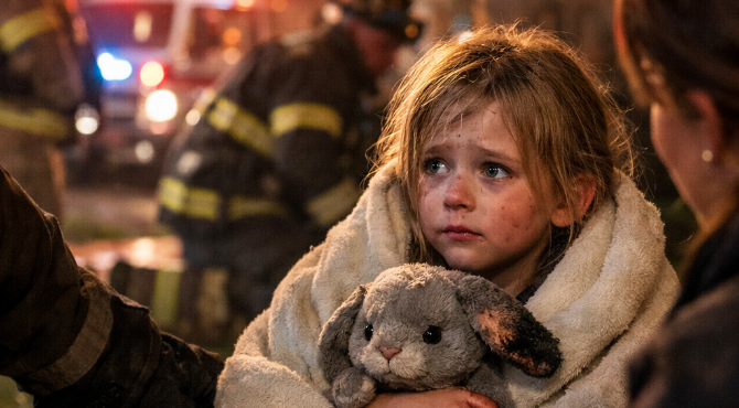 She was wrapped in a blanket, clutching a small gray rabbit with one singed ear. When they set her down, she looked around desperately, as if her family had to be nearby.