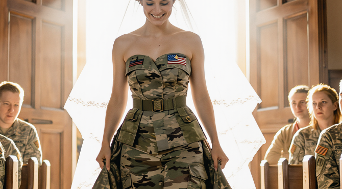 My Fiancée Walked Out in a Wedding Dress Made from Army Shirts—Her Next Words Left the Entire Church in Tears Posted on April 10, 2026April 10, 2026 by admin