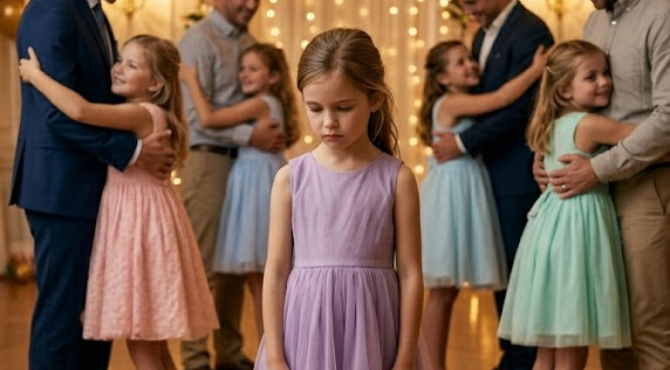 At first, Emma stayed close to her mother, silently watching the other girls dance with their fathers—some twirling, some lifted into the air, all smiling and laughing as if it were exactly how it was meant to be.