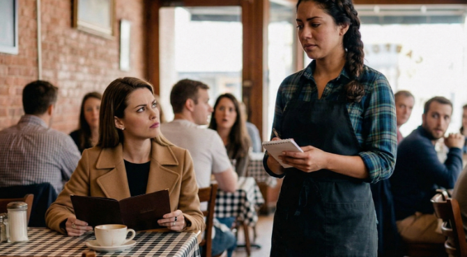 She waved her hand dismissively. “Just bring me the wine list. And wipe this table again—it’s sticky.”