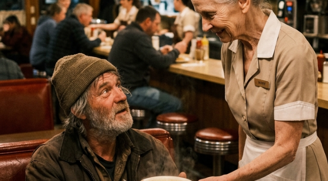 It was close to closing time when the door creaked open. A blast of cold air rushed in, carrying the scent of rain and damp leaves. Margaret, who had been clearing a nearby table, turned to see a homeless man step inside hesitantly. His clothes were tattered, his face partly hidden beneath a thick, unkempt beard. His hands trembled as he rubbed them together, trying to warm up.