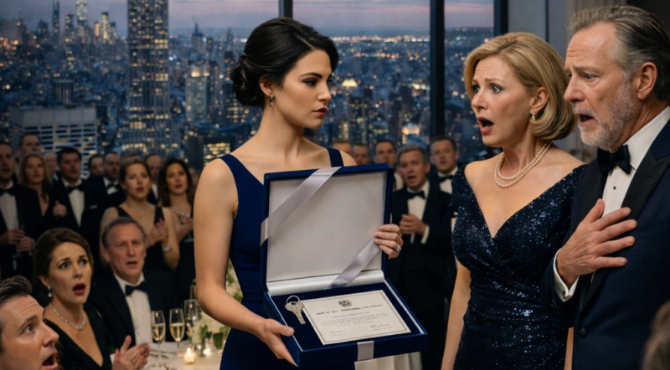 I stood there in a black dress, holding a navy-blue box, while fifty faces slowly turned toward me.