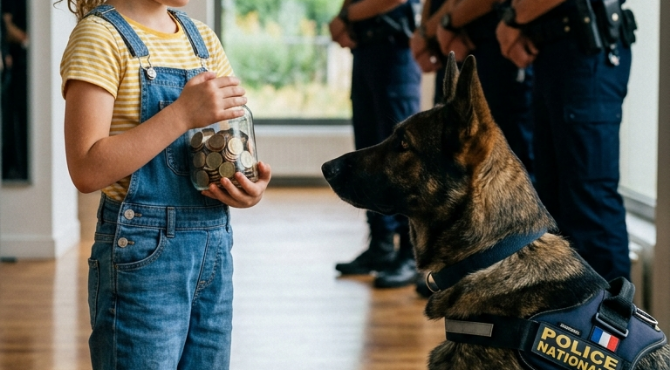 Léa Laurent wasn’t the type of child to stumble into forbidden places by accident. At eight years old, small, quiet, but fiercely determined, she pushed open the heavy oak doors of the Hôtel des Ventes des Domaines in Lyon. Her yellow boots, soaked by the icy October rain, squeaked softly on the marble floor, but she paid no attention. Clutched tightly to her chest was a large glass jar filled with coins. Every step was heavy with purpose; a mission that mattered more than anything, making her heart pound in her tiny chest. She hadn’t come out of curiosity—she had come to save Tango, the Belgian Malinois, a former elite dog of the Anti-Crime Brigade, and the loyal partner of her mother, Captain Élise Laurent, who had tragically died seven months earlier in a disastrous operation.