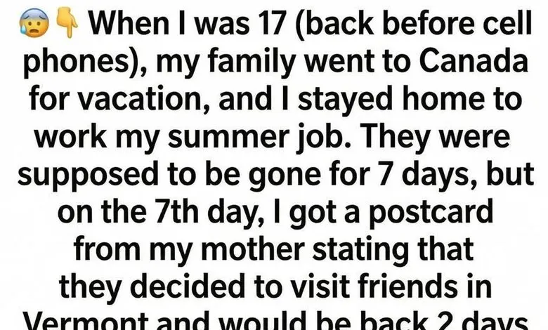 I was seventeen, old enough to taste freedom but still young enough to fear the quiet. The summer my family left for Canada without me, our house felt larger than it ever had—rooms echoing, clocks ticking too loudly, and nights stretching thin. They were supposed to be gone seven days. I worked mornings at a grocery store, came home to microwave dinners, and slept with the radio on for company. On the seventh day, a postcard arrived. It was addressed in my mother’s handwriting, cheerful and looping. She wrote that they had decided to stop in Vermont to visit friends and would return two days later than planned. I remember feeling oddly relieved, like the house itself had exhaled.