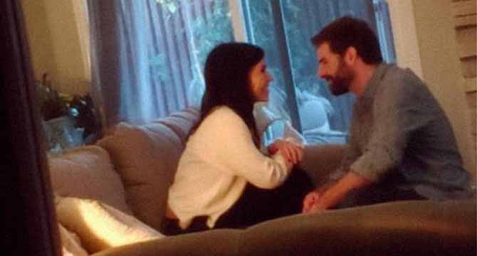 Her leaning against him, his hand on her waist.